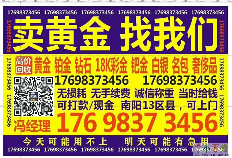 黄金回收就找冯经理办理电话17698373456全南阳市县乡镇专业上门回收、各种、手表、名表、钻石、黄金、白金、铂金、钯金、Au750金、18K金、项链、戒指、手镯、玫瑰金、Au916金、钻戒等贵金属首饰。专业鉴定、可现金支付、也可微信或其它方式可转账、严格保密。本店主要回收以下物品:一、黄金类回收:足金、千足金、万足金、24K、22K、18K、14K、白金、项链、吊坠、戒指、耳钉、耳环、耳坠、手链、手镯、摆件、金条、各种制品。二、铂金类回收:PT999、PT990、PT950、PT900、千足铂等项链、戒指、耳钉、耳坠、镶钻首饰、金条、等各种铂金制品。小_生_活_网